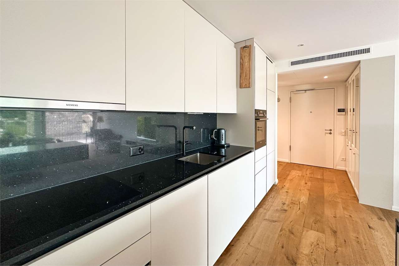 Die Wohnung empfängt Sie mit einem einladenden Entrée, das zum hellen Wohnbereich mit offener Küche führt. Von hier aus haben Sie direkten Zugang zur überdachten Terrasse – eine natürliche Erweiterung des Wohnraums, perfekt für entspannte Abende oder Frühstück im Freien.