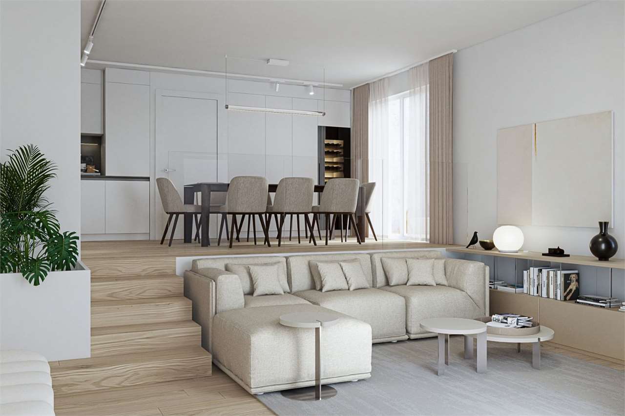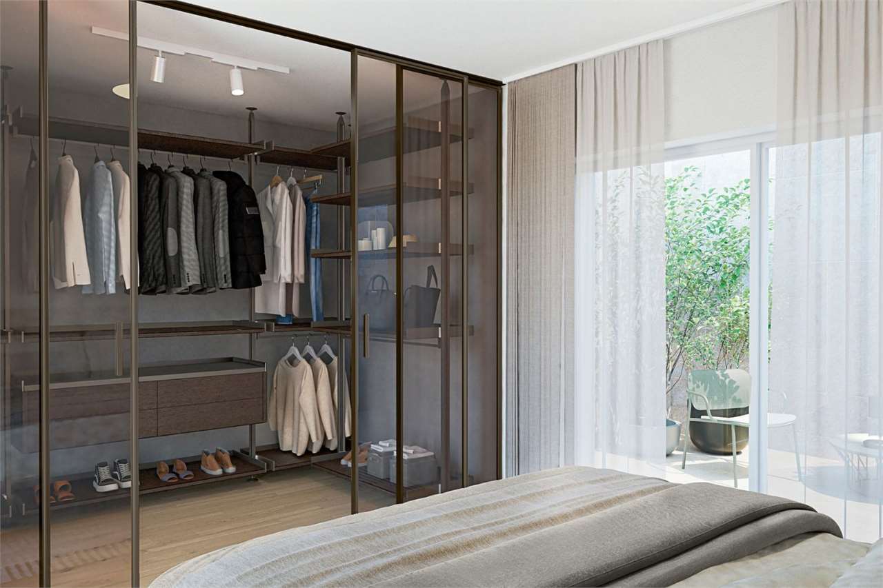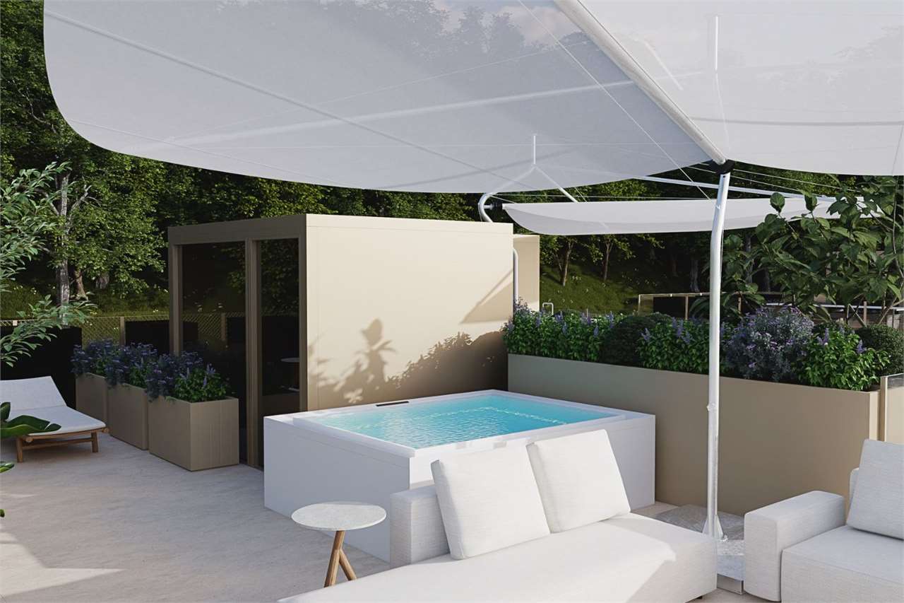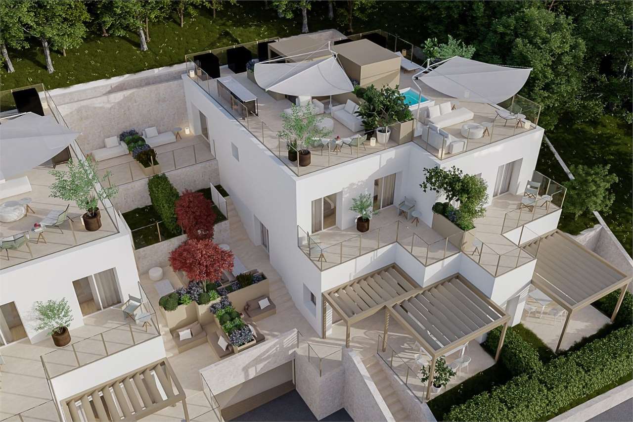 The housing units are spread over three different floors: a large and bright living area is located on the ground floor consisting of a modern and equipped kitchen, and a living room that overlooks the outdoor patio, a true and proper extension of the internal space thanks to the use of bioclimatic pergolas included in the specifications. We also find on the same floor a service bathroom and a laundry room.