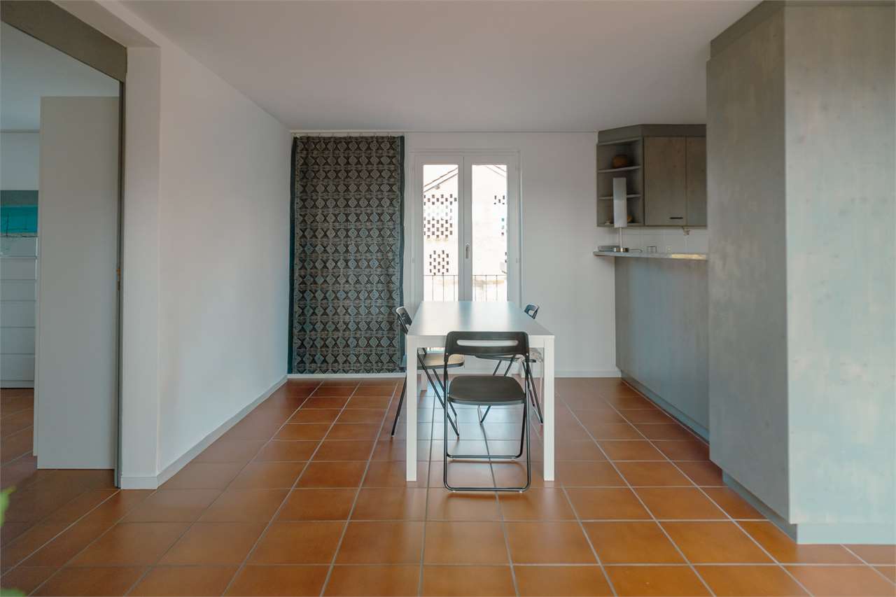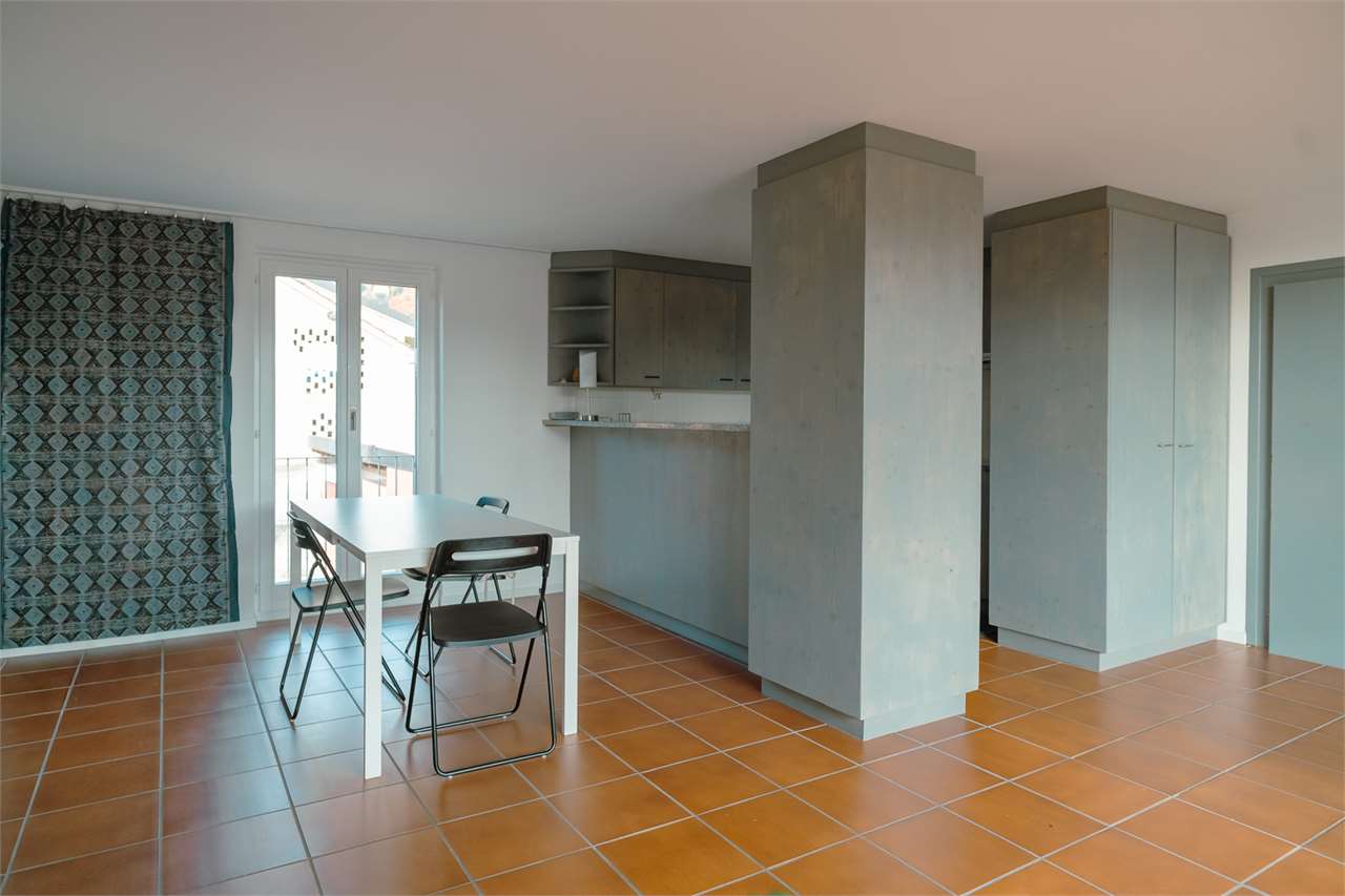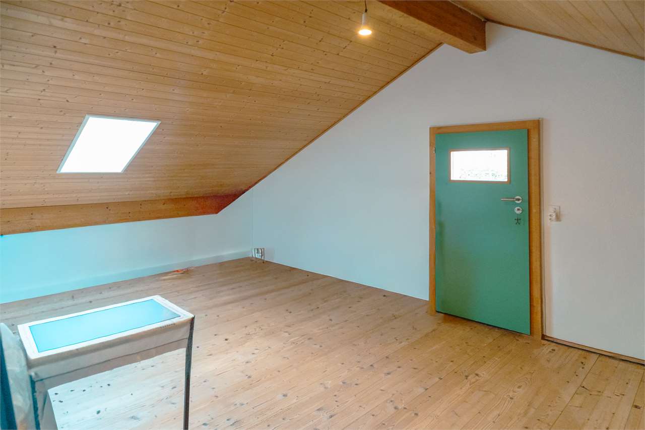 La partie supérieure est un appartement duplex de 4,5 pièces, rénové avec soin : un séjour accueillant, une cuisine ouverte où partager le pain, une chambre donnant sur un balcon comme sur un petit tableau du village, une salle de bain neuve. Plus haut, la mansarde s’ouvre en une pièce claire comme une pensée heureuse, avec des fenêtres tournées vers l’horizon, une seconde toilette et un espace disponible pouvant devenir atelier, bureau ou refuge secret.