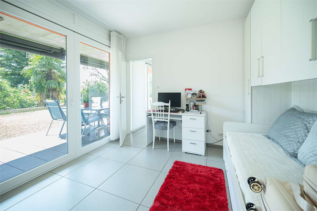 La zona notte include due camere da letto, una delle quali è attualmente utilizzata come cabina armadio. La camera padronale dispone di un bagno en suite completo di lavabo, wc, bidet, vasca da bagno e attacco per lavatrice. Entrambe le camere offrono un accesso diretto al giardino, rendendo gli spazi esterni facilmente fruibili e perfetti per chi ama la natura o ha animali domestici.