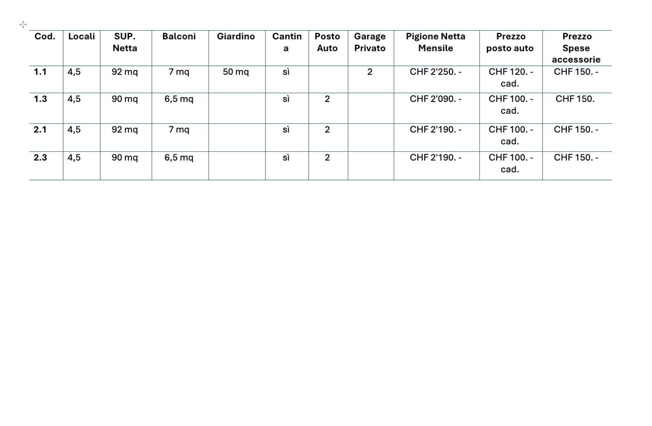 Sono disponibili 4 appartamenti da 4.5 locali di circa 90 mq, ampi e luminosi, perfetti per nuclei familiari. Ogni appartamento dispone di terrazza privata, posteggio coperto e spazi interni ben distribuiti con finiture moderne.