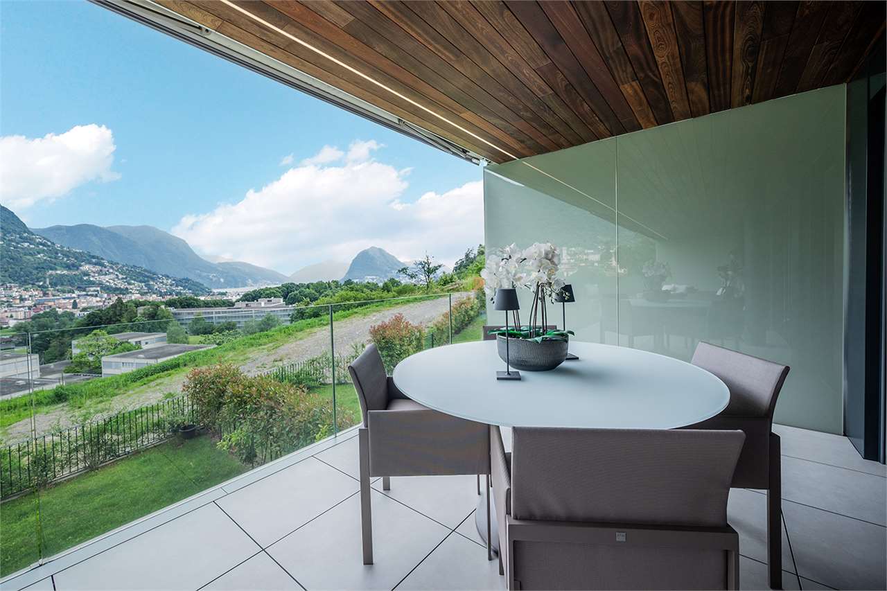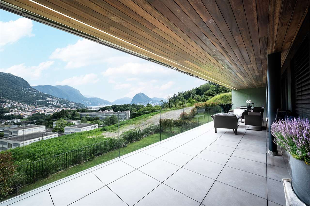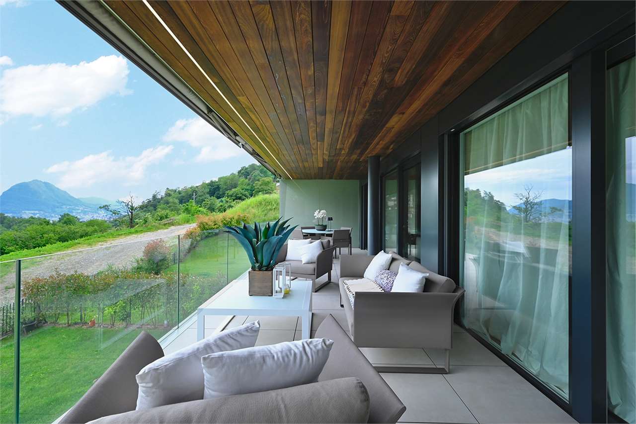 Gli ambienti interni, ampi e luminosi, si fondono con l’esterno grazie a grandi vetrate che si affacciano su una terrazza coperta di 45 mq: il luogo perfetto per pranzi all’aperto, momenti di relax e serate con vista sul lago di Lugano che cambia colore al calar del sole.