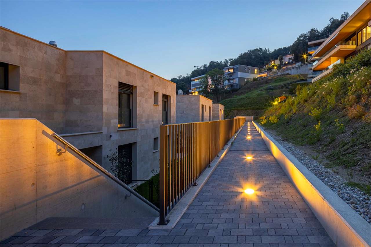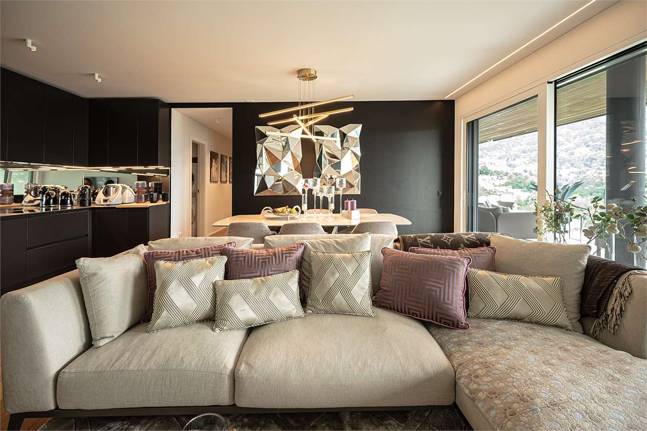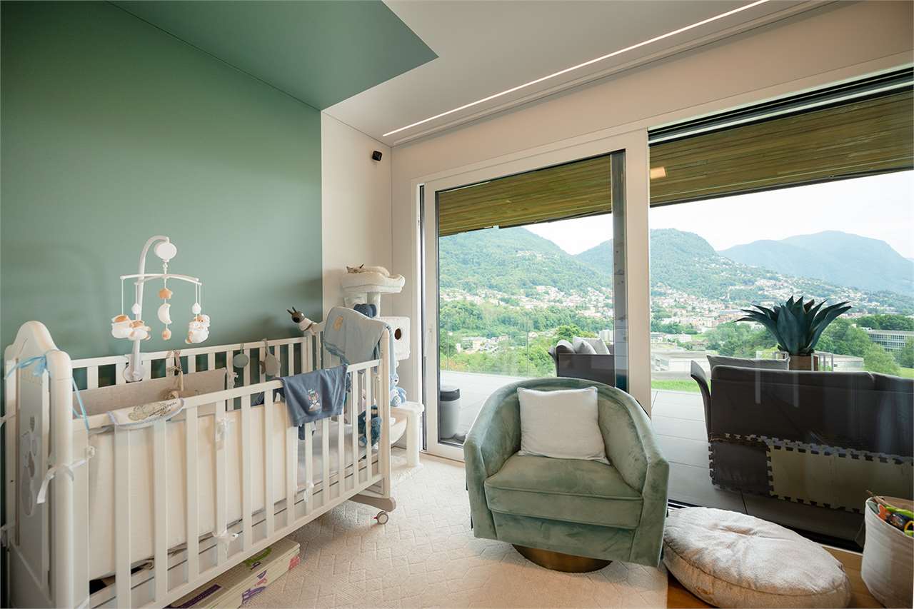 Gli ambienti interni, ampi e luminosi, si fondono con l’esterno grazie a grandi vetrate che si affacciano su una terrazza coperta di 45 mq: il luogo perfetto per pranzi all’aperto, momenti di relax e serate con vista sul lago di Lugano che cambia colore al calar del sole.