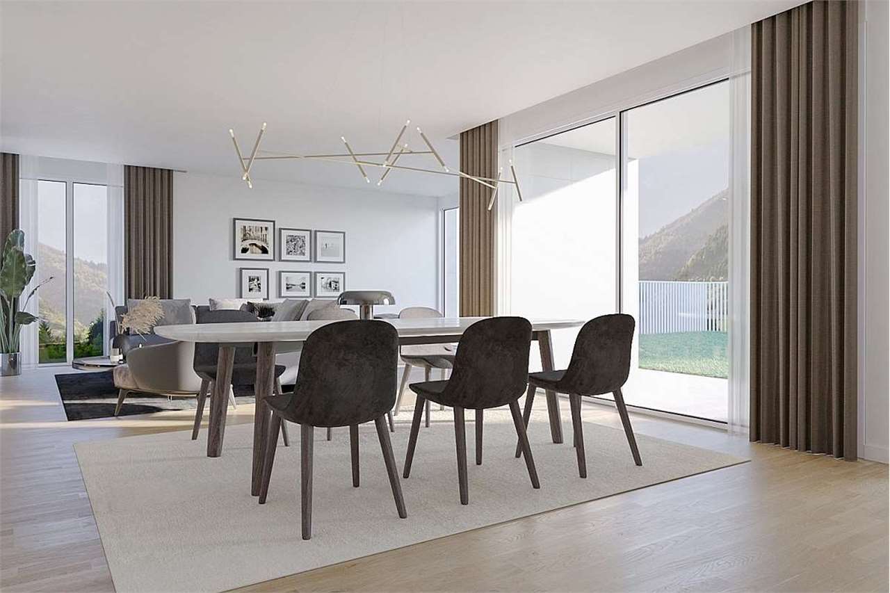La zona giorno si compone di uno spazioso soggiorno con sala pranzo dalla quale, grazie alle ampie vetrate scorrevoli, si accede al terrazzo ed al giardino. La sala da pranzo è in oltre collegata ad una moderna cucina semi aperta. Troviamo infine uno studio con bagno per ospiti, dal quale si può accedere direttamente alla terrazza.