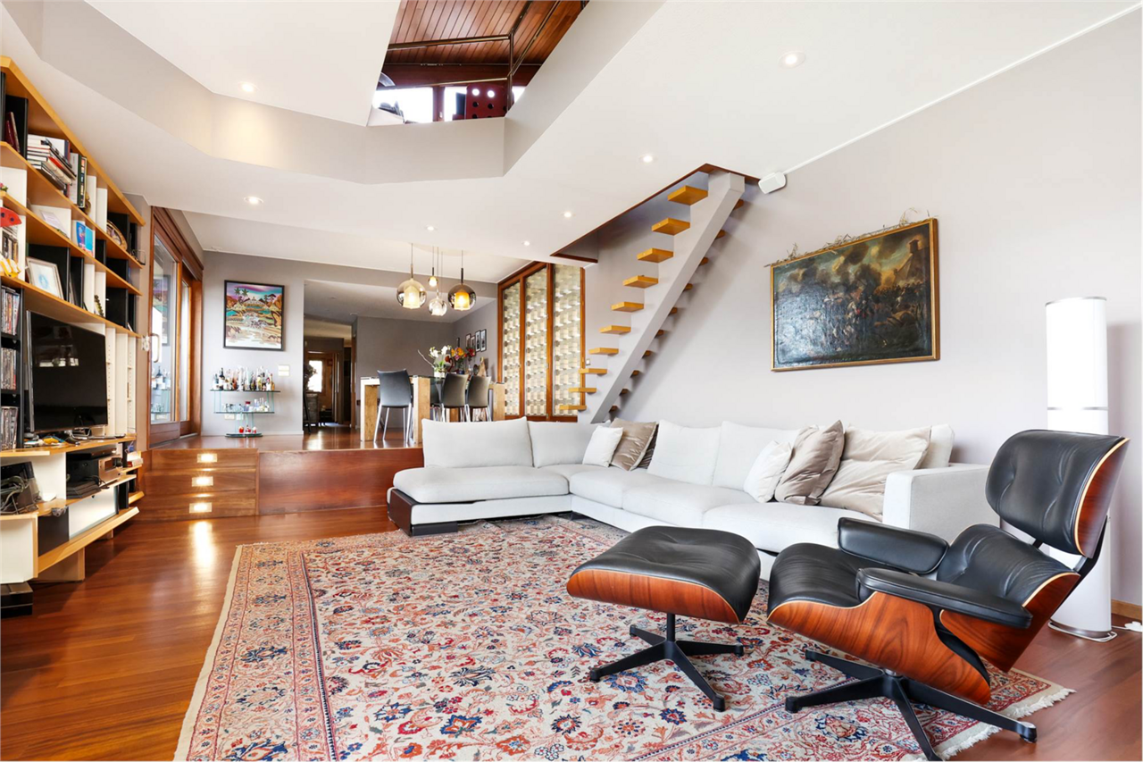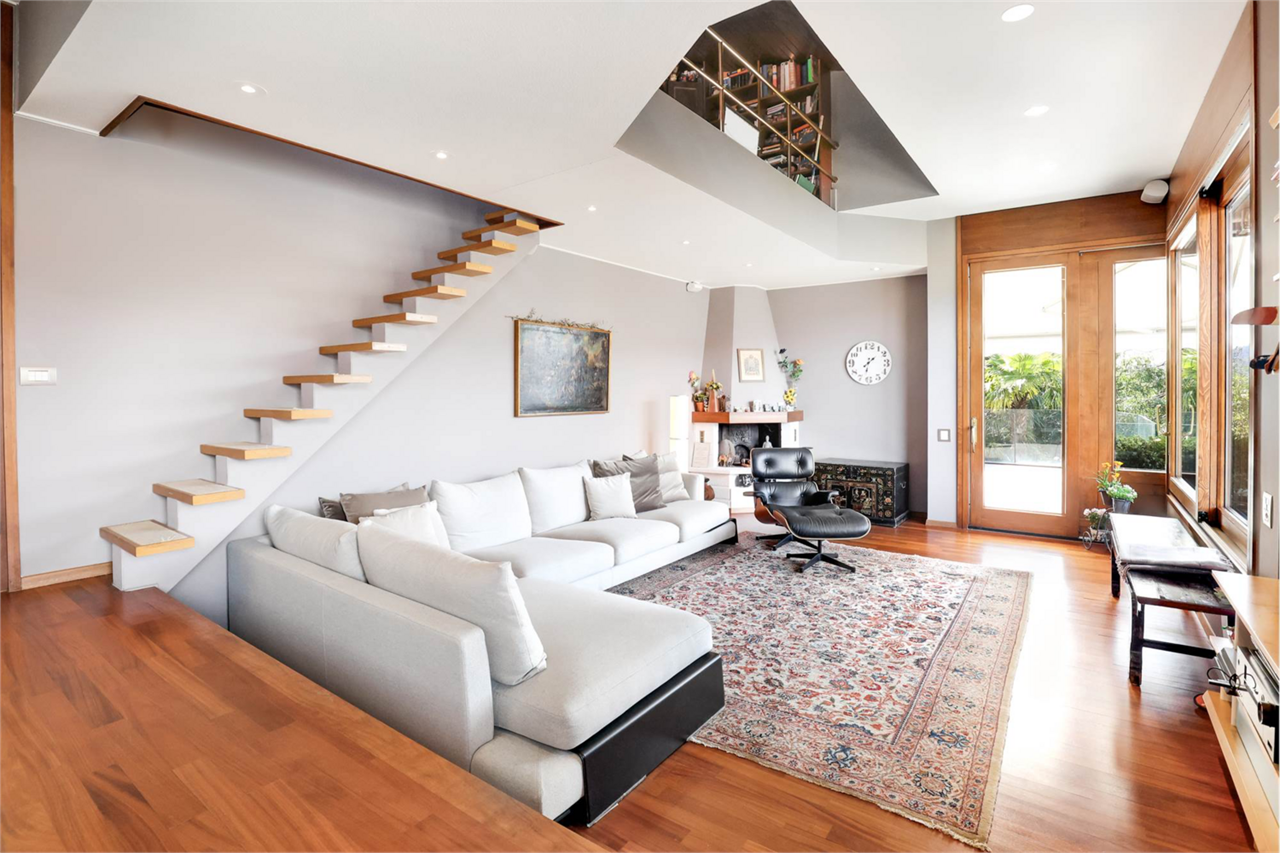 Il cuore della casa è rappresentato dal luminoso salotto con soppalco e cucina a vista, uno spazio ideale per ricevere ospiti o trascorrere momenti in famiglia. Un pratico bagno di servizio completa la zona giorno.