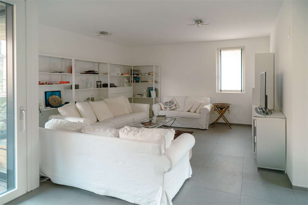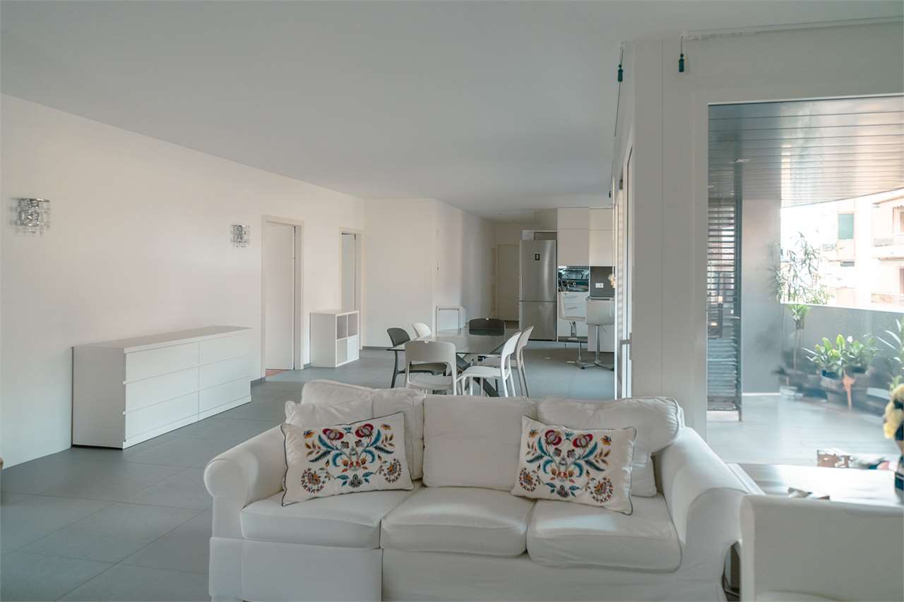 Ampia zona giorno: cucina a vista moderna, area living per divano e TV, e accesso a un terrazzo spazioso ideale per rilassarsi.