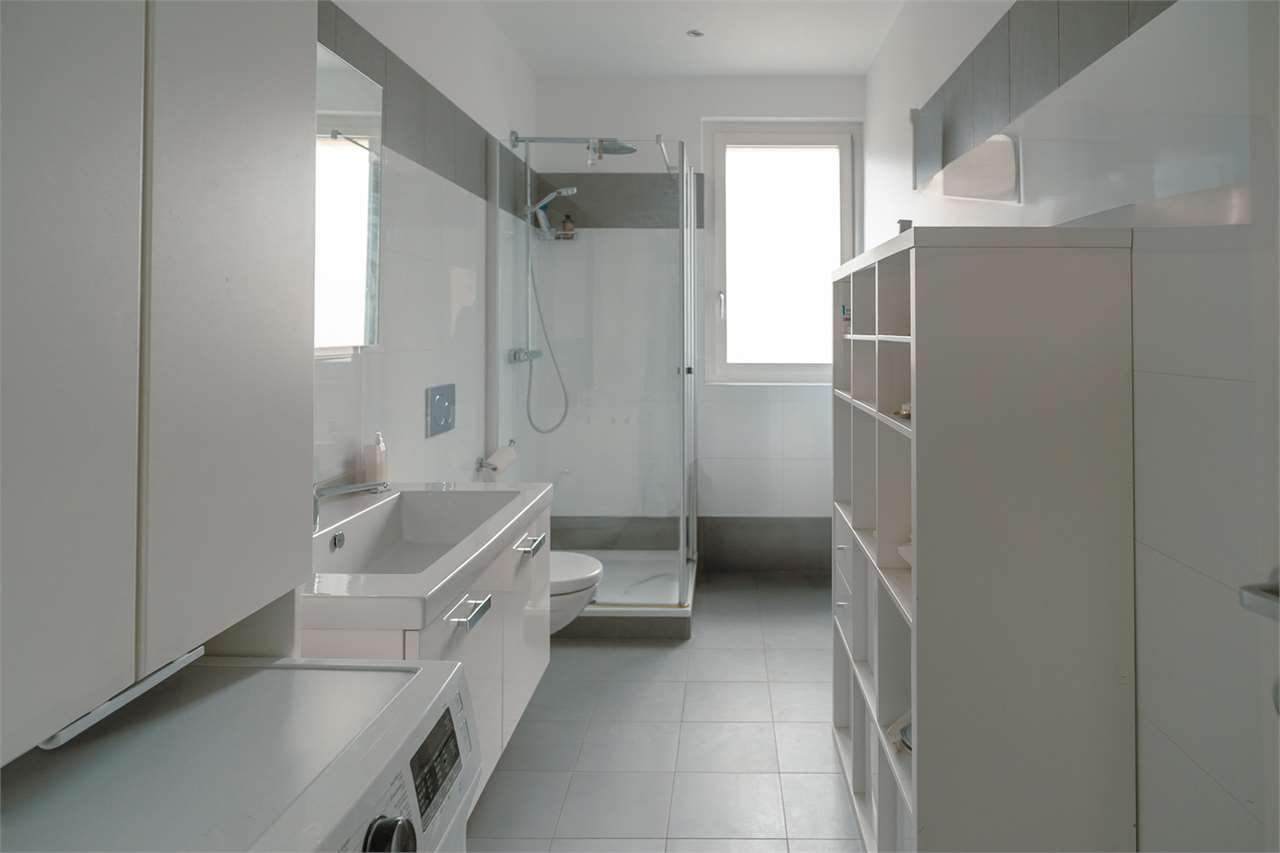 Secondo bagno: con doccia, finestra e zona lavanderia/lavasciuga integrata.