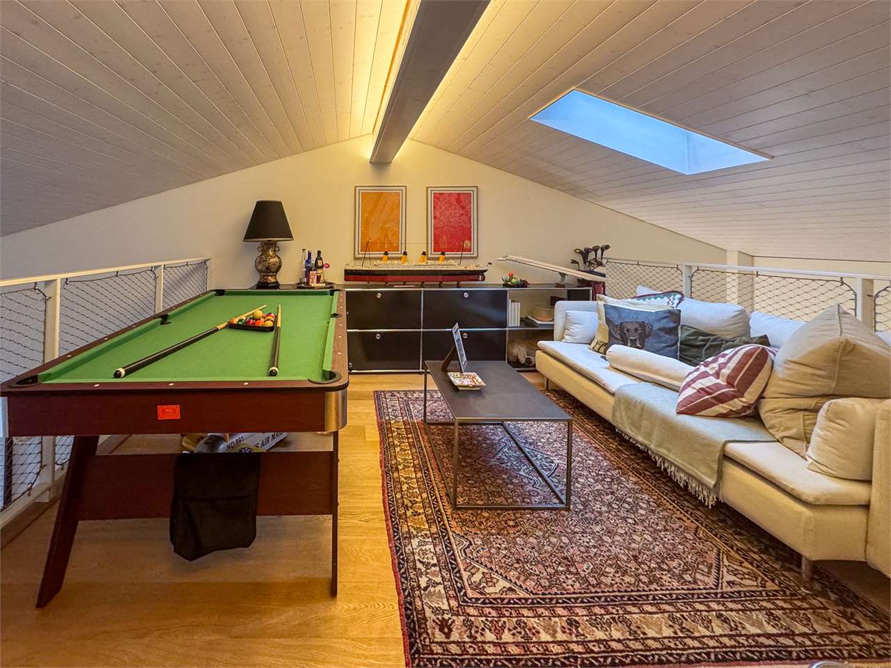 La proprietà è servita da ascensore che collega il piano abitativo direttamente al piano terra, dove si trova un garage attrezzato con colonnina di ricarica per auto elettrica e ampie armadiature.