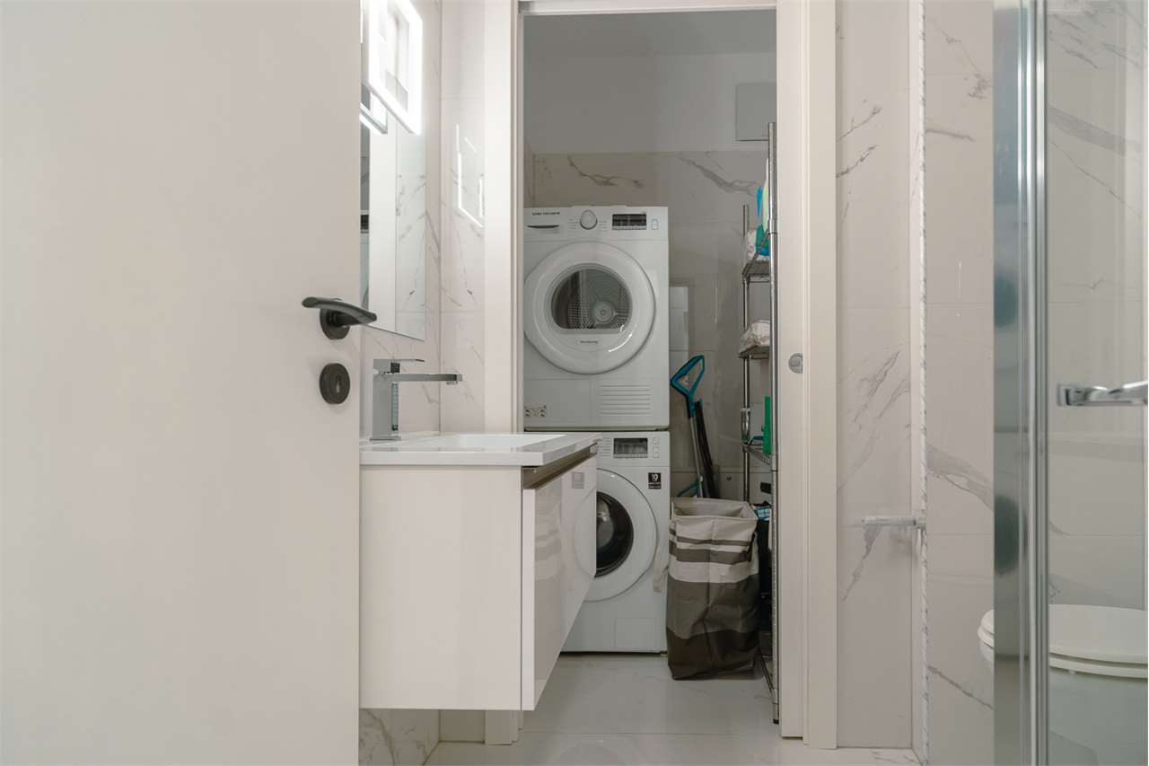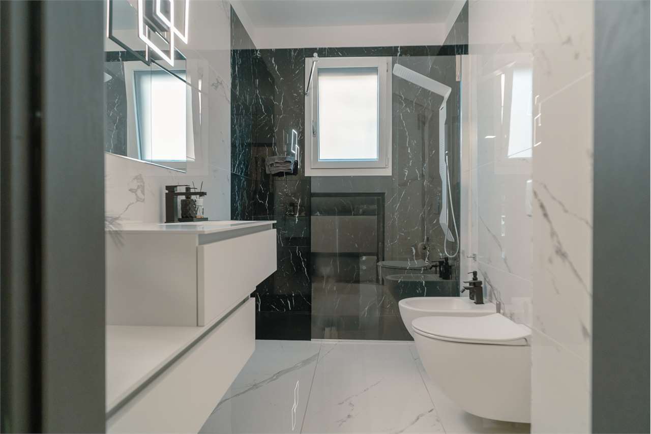 La zona notte comprende tre camere da letto spaziose, adatte a famiglie, professionisti o chi cerca ambienti versatili anche per lo smart working. Completano l’appartamento due bagni eleganti, di cui uno con lavanderia privata integrata.